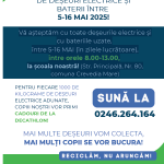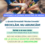 Vă așteptăm cu toate deșeurile electrice și cu bateriile uzate, între 5-16 MAI (în zilele lucrătoare), între orele 8.00-13.00, la școala noastră! (Str. Principală, Nr. 80, comuna Crevedia Mare).