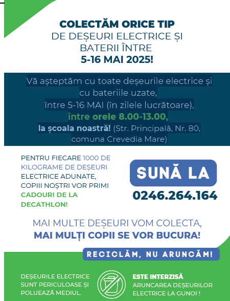 Vă așteptăm cu toate deșeurile electrice și cu bateriile uzate, între 5-16 MAI (în zilele lucrătoare), între orele 8.00-13.00, la școala noastră! (Str. Principală, Nr. 80, comuna Crevedia Mare).