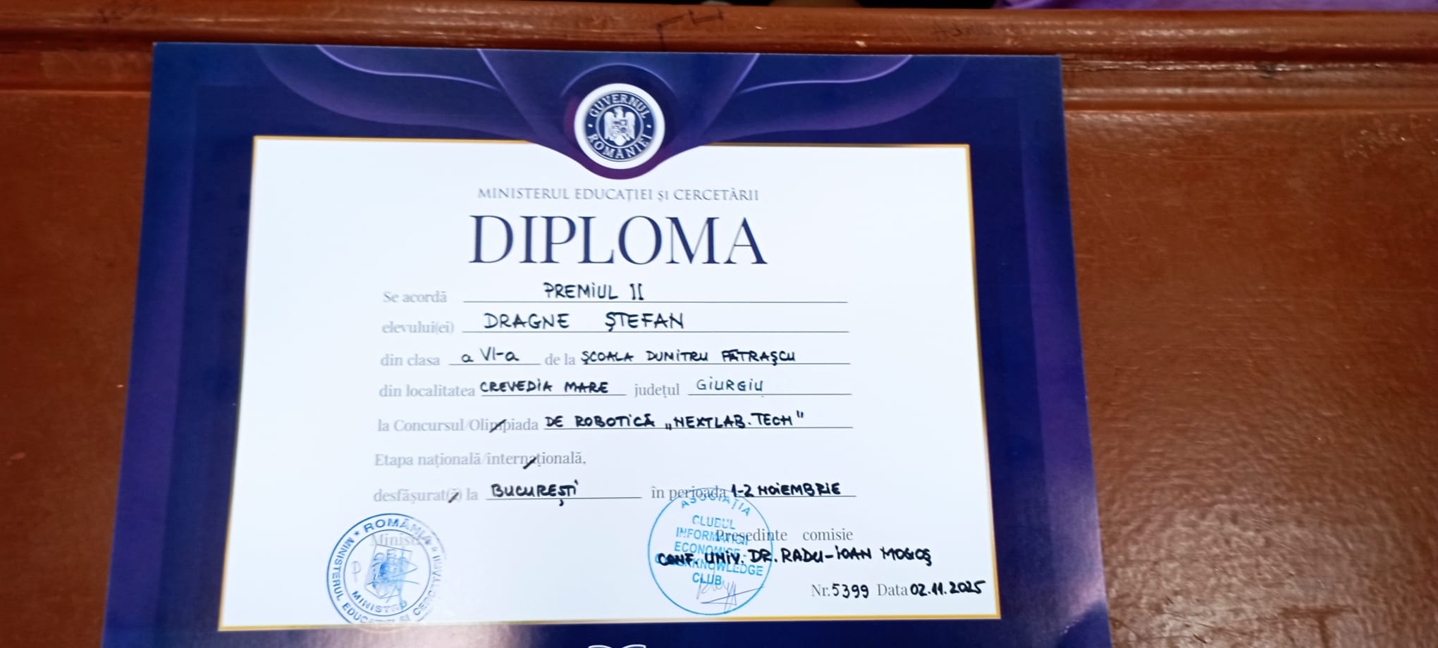 Felicitări elevului școlii noastre, DRAGNE ȘTEFAN (clasa a VII-a, Școala Gimnazială „D. Pătrașcu”, comuna Crevedia Mare), pentru rezultatul obținut – PREMIUL al II-lea 🥈 – la proba Line-follower advanced (8-12 ani)– Etapa Finală a Concursul Național de Robotică Școlară NEXTLAB.TECH, Ediția 2025!!, probă care testează viteza, precizia programării și fiabilitatea construcției robotului pe un traseu complex.